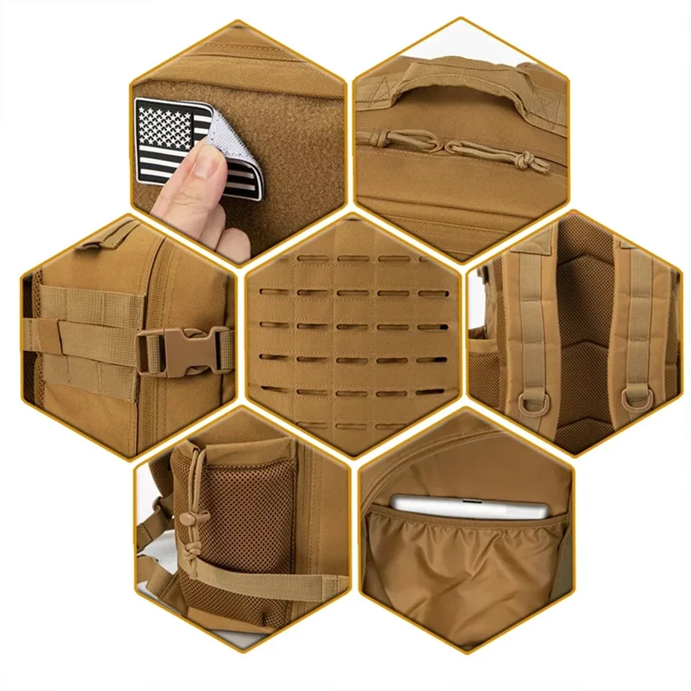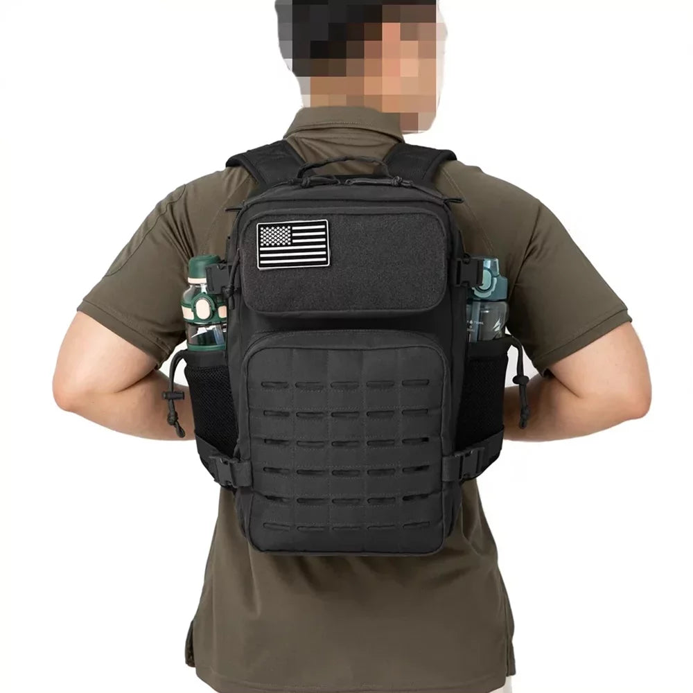 Avec des dimensions optimales de 40cm x 25cm x 25cm, le sac à dos Tactique offre un espace généreux pour tous vos équipements essentiels, des accessoires de plein air aux nécessités quotidiennes. Sa conception multicouche offre des compartiments de rangement spacieux, tandis qu'une large surface de Velcro vous permet de personnaliser le sac avec les patchs de votre choix, un patch drapeau américain étant inclus en cadeau.